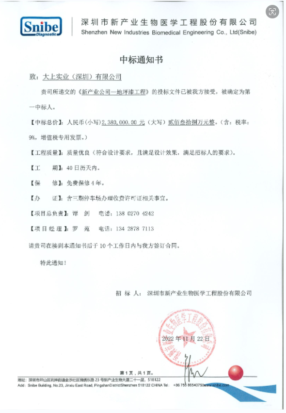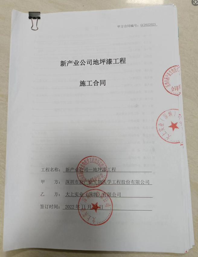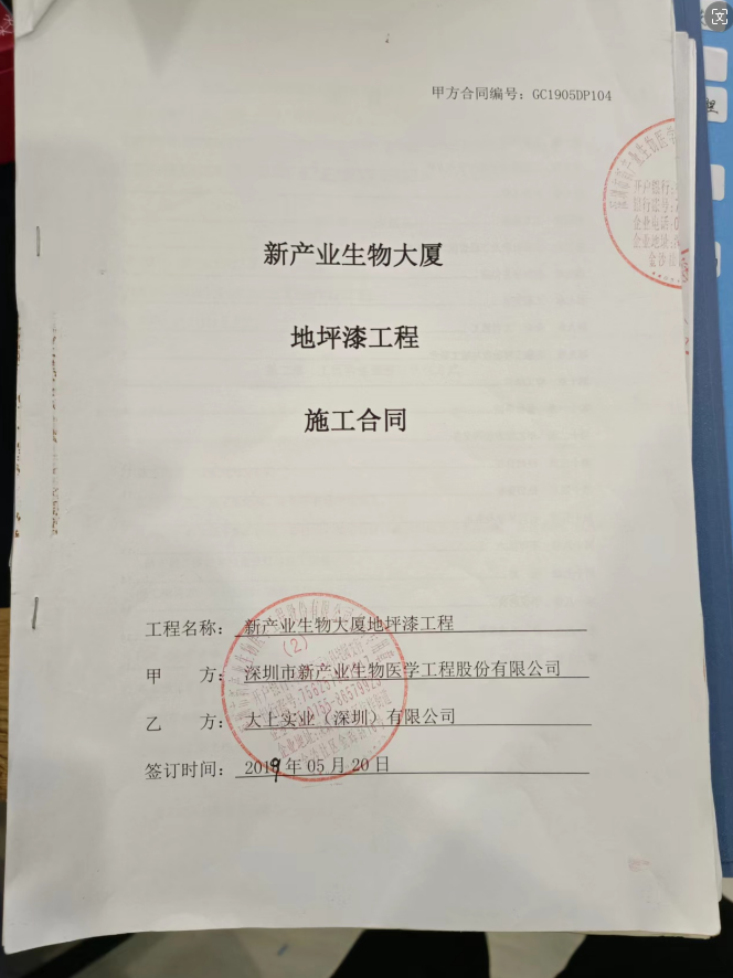 我司大上實(shí)業(yè)于2019年有幸城建“新產(chǎn)業(yè)生物大廈地坪漆工程”,后因工程質(zhì)量好,使用三年仍然如新,甲方于2022再次邀請(qǐng)我司投標(biāo),我司再次幸運(yùn)中標(biāo),2019年及2022年簽訂合同工程金額及簽證款總額超500萬元。