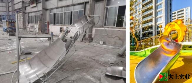 異形滑梯通過不銹鋼板人工鍛造工藝,控制板弧度及直順度保證滑梯品質(zhì)及安全舒適性。