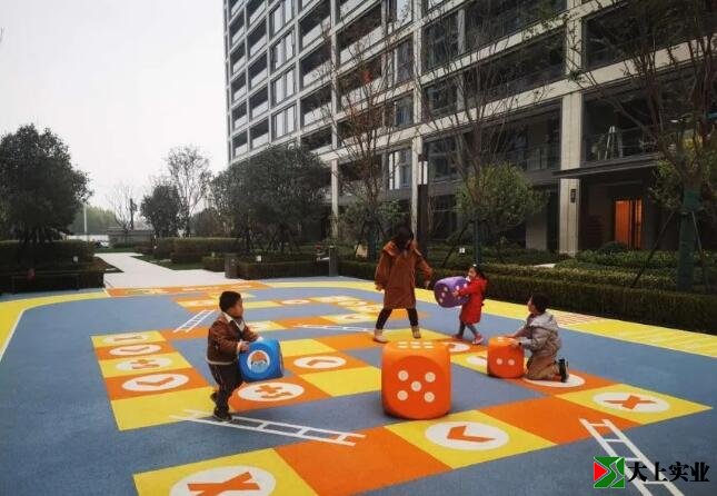 杭州玖樟臺蛇形棋游樂場通過塑膠地墊中加入蛇形棋盤、兒童跑道、跳遠等圖案,結(jié)合定制骰子軟裝為小業(yè)主提供趣味活動的想象空間。