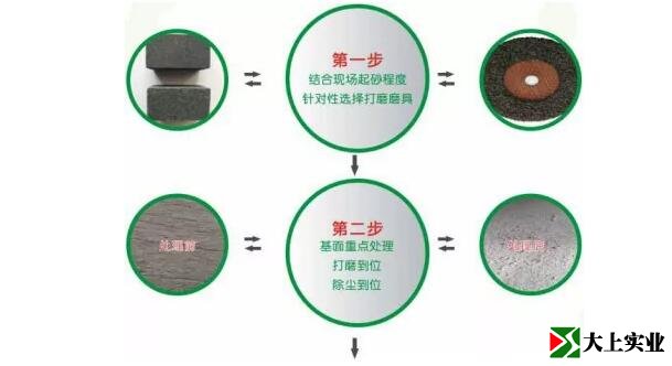 用金剛磨頭或磨石磨頭打磨表層至符合施工水性聚氨酯地坪層對基面的要求,方可按實(shí)際情況要求施工水性聚氨酯地坪