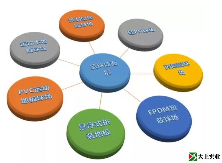 大上實(shí)業(yè)小編就通過(guò)一張圖介紹籃球場(chǎng)面層材料的分類(lèi),再詳細(xì)論述各種材料面層的特點(diǎn),讓您對(duì)如何選擇籃球場(chǎng)面層材料做到心中有數(shù)。羽毛球場(chǎng)、排球場(chǎng)等也可參照這些標(biāo)準(zhǔn)選擇。