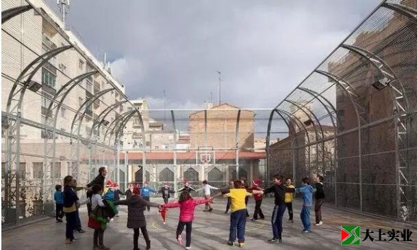 Lasalle Franciscanas學(xué)校位于西班牙Zaragoza,其操場(chǎng)經(jīng)常用于學(xué)生的課間娛樂,課外活動(dòng)以及孩子們與家長(zhǎng)間接送的集散空間。于是常常造成使用上的重圖,進(jìn)出校門的人群與操場(chǎng)上正在活動(dòng)的學(xué)生間的相互干擾。于是當(dāng)?shù)豃1 arquitectos 事務(wù)所的建筑師Guzman de Yarza Blache被委以此任,要求在擴(kuò)大33*35米操場(chǎng)的使用面積的同時(shí),在不影響學(xué)校日常體育和休閑活動(dòng)的前提下,滿足接送家長(zhǎng)人員流動(dòng)的需求。