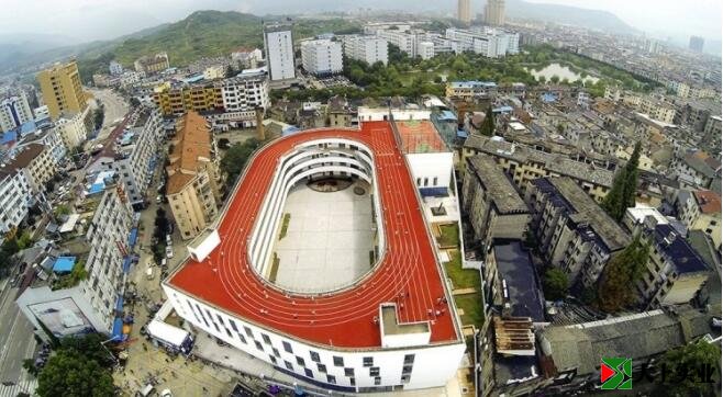 浙江省天臺縣赤城街道第二小學是一所小學教育大樓,在多層建筑物的屋頂上有200米的圓形跑道。 這種智慧的概念是由于場地的土地面積極為有限:在屋頂上鋪設(shè)了一條200米的標準跑道,從而為地面學校額外贏得了3000平方米的公共空間。