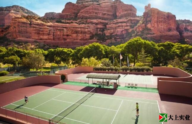 坐落在博因頓峽谷高聳的紅色巖石峭壁之間的室外硬地網(wǎng)球場??梢栽谫惡笙碛萌章潆u尾酒,然后看著周圍的峽谷變成深紅色的陰影。