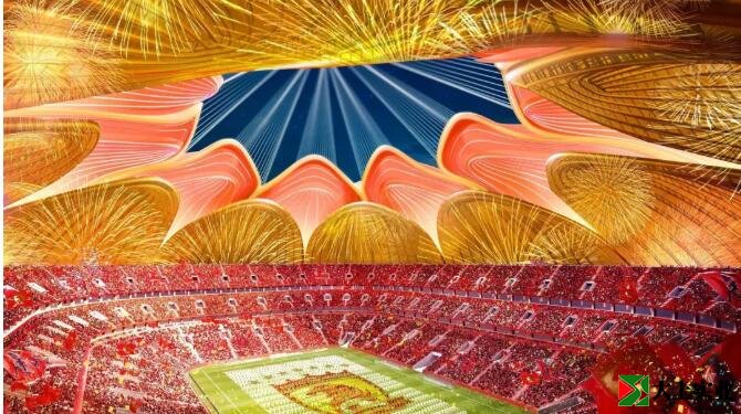 看到開工儀式的主KV,我就已經(jīng)感覺不妙了。這撲面而來的災(zāi)難配色,只能說,呃……很恒大。乍一看前面兩張足球場的效果圖,就還是很……恒大。