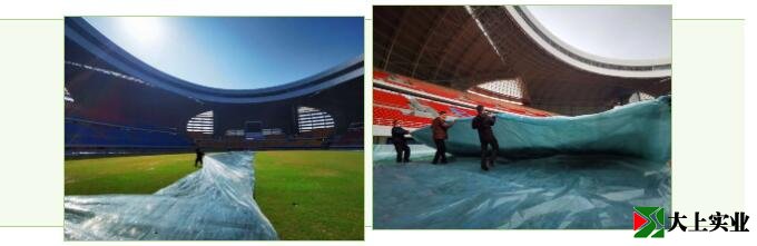 在三月上旬時草坪一片生機盎然,場地的防凍保暖措施就尤為重要,我們請來了專業(yè)的工作人員對比賽草坪進行了塑料布全場地覆蓋,讓草坪適應寒冷的天氣。